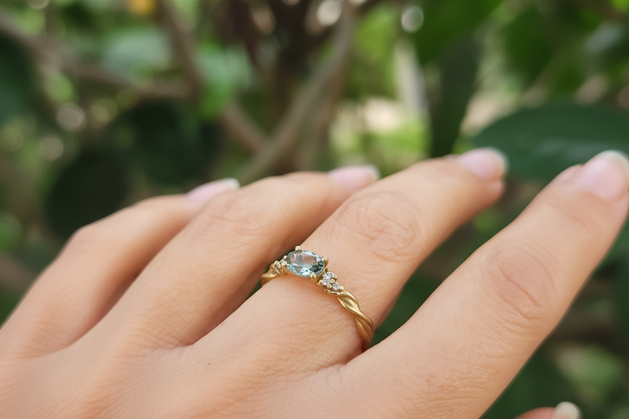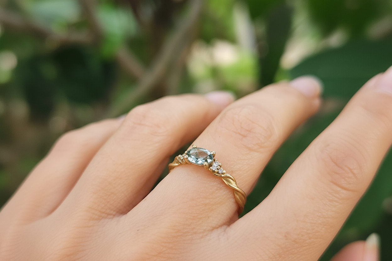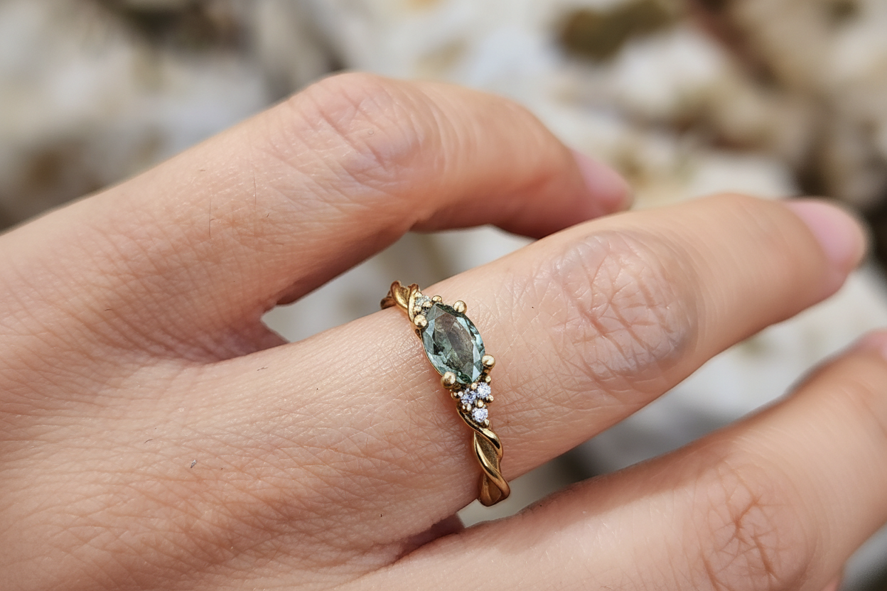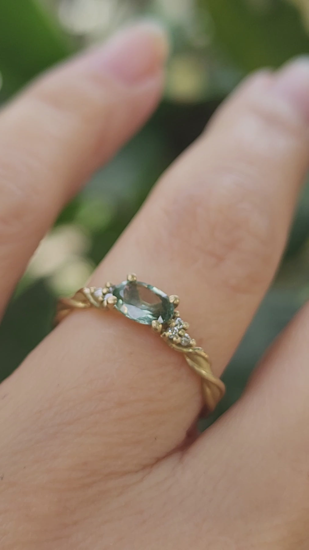 טבעת זהב ייחודית עשויה זהב 14K בעבודת יד מלופפת ענפי זהב, משובצת אבן ספיר ירוקה מרכזית ו-6 יהלומים.