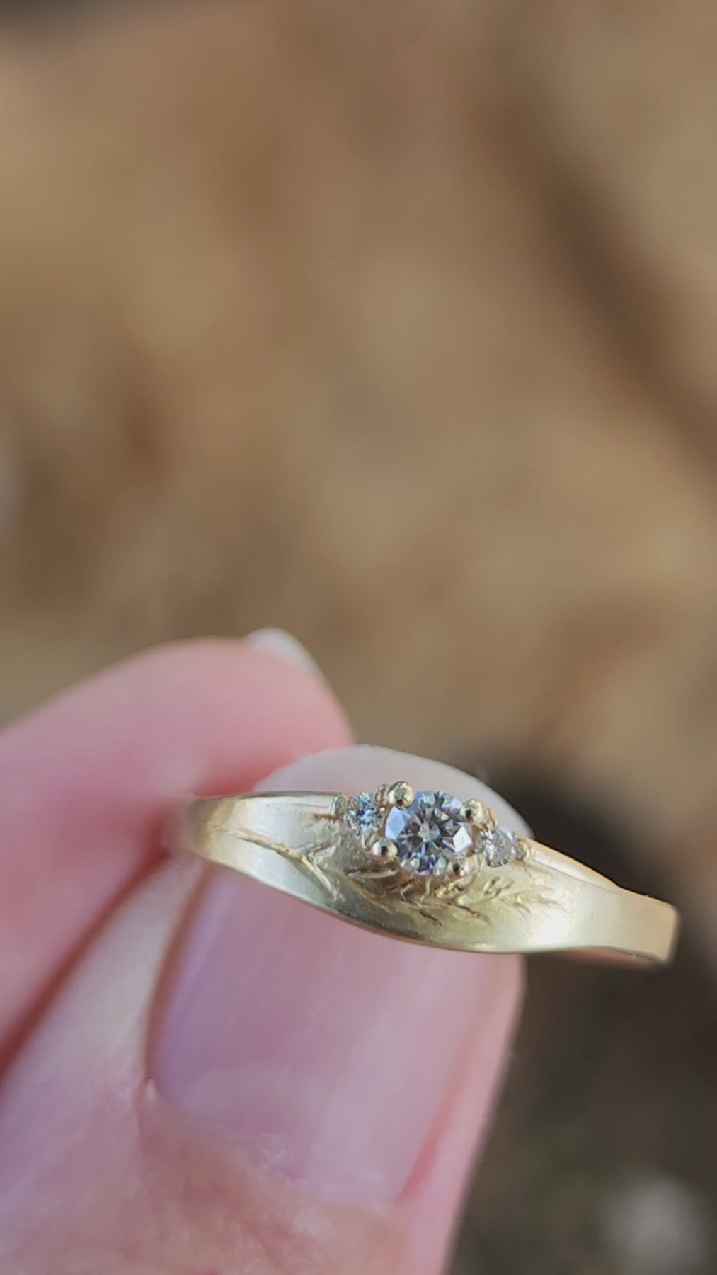 טבעת זהב אלגנטית עם חריטה טבעית ושיבוץ יהלומים עדין ומרשים. העיצוב מחבר בין טבע לאלגנטיות מודרנית ועל-זמנית. יכולה להיות טבעת אירוסין מדהימה.